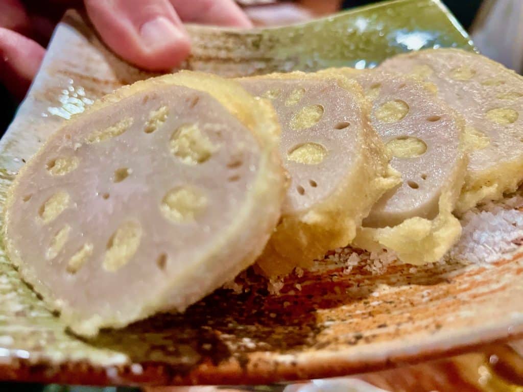 The next dish we got was a plate of renkon tempura, lotus root slices lightly battered and fried until golden. They were crunchy on the outside, with that starchy almost chestnut-like sweetness inside.