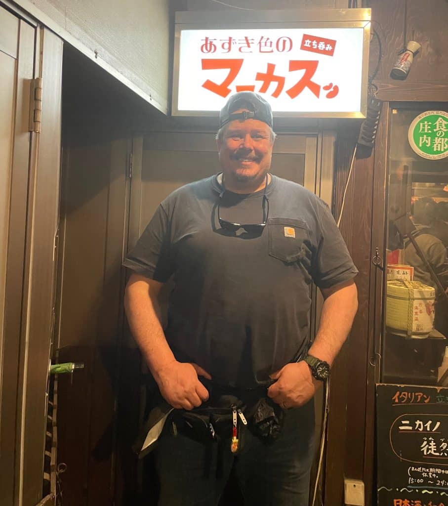 Known around the town and well versed on all things Osaka nightlife, Tatsuya “Tats” Inaoka originally put Azuki Iro no Marcus on our radar. “You’ve got to try that place! We were just there, we ordered the shiitake mushrooms with parmesan cheese,” says Tats, an Izakaya standing bar enthusiast since the late seventies. “”I like them a lot.”