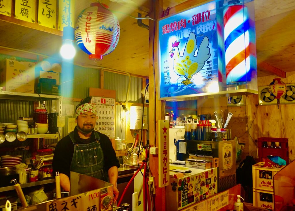 The chef is a friend of Tomokazu, and he has a very rare last name, Gorin (ไบ่ผช), which means Olympics. I ask him about the barber pole sign that is spinning over the counter. Chef Gorin tells me that he originally crossed out the “ber” so the sign said “Bar” But then he decided to replace it with a sticker of a diagram of chicken parts.